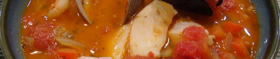 So I started looking around for a good recipe and my Williams-Sonoma Essentials of Mediterranean Cooking had a good looking recipe. Of course it served 6-8, so the test was to see if I could get it down to a single serving size. Naturally I failed! By the time you add some fish, clams, mussels, shrimp….well lets just say it serves 1 with leftovers.